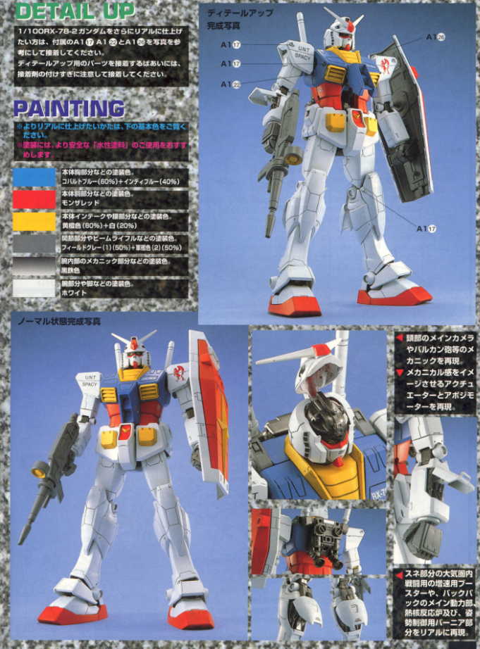 Like all the kits in the MG series, the level of detail is superb, and virtually everything moves. Panels on the legs flip open to reveal internal mechnisms. The head has a panel, too. The "Core Fighter" cockpit ship can be removed from its belly. Fine mesh parts cover the inside of the chest air intakes for added realism. Three types of hands are included -- open palm, fists, and poseable (moving fingers) for gripping any of the several weapons that comes with the kit.